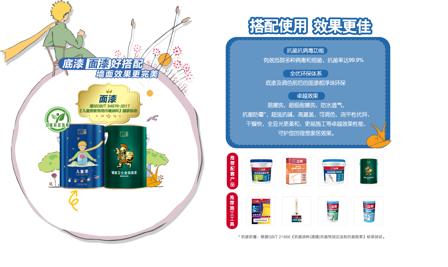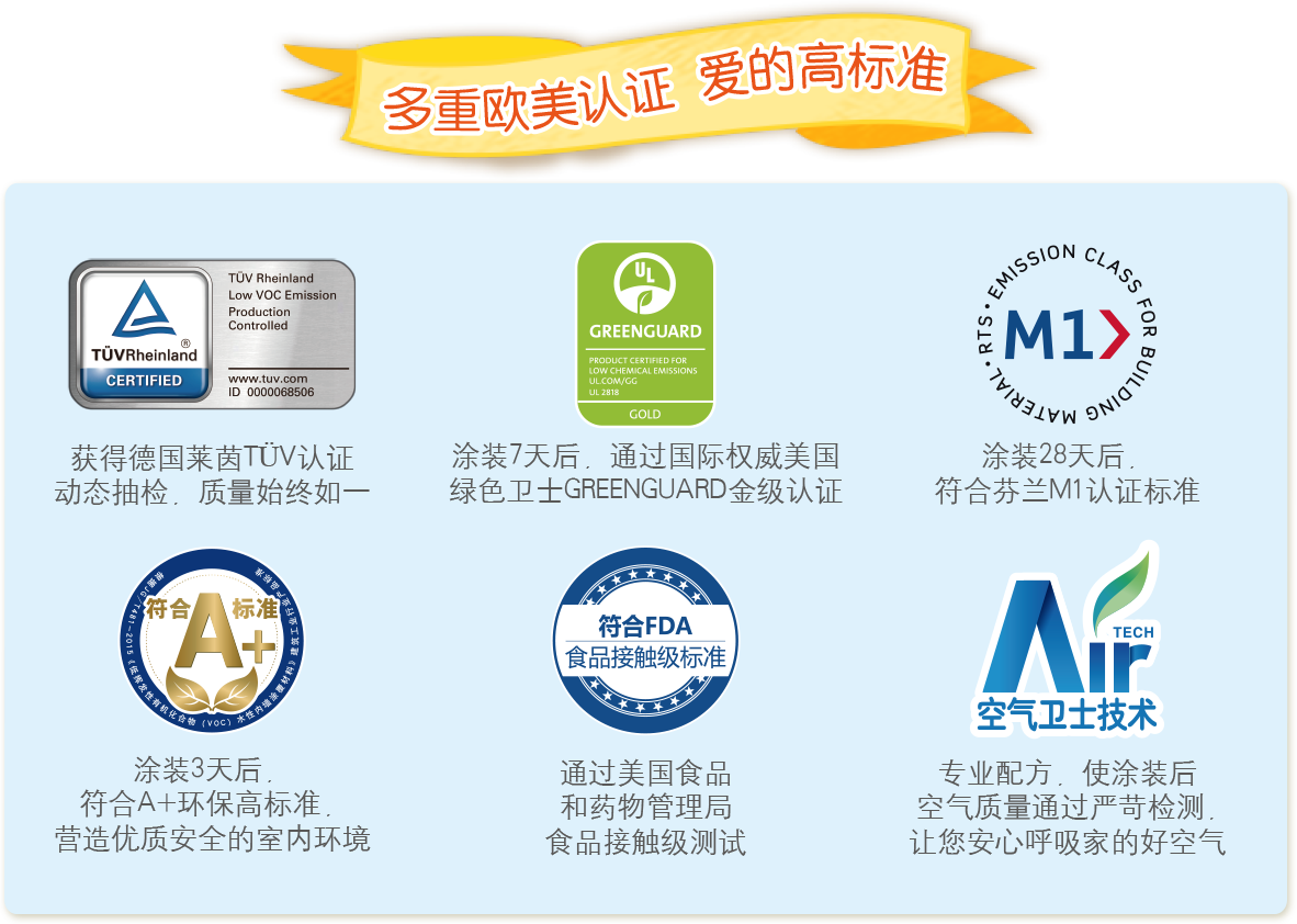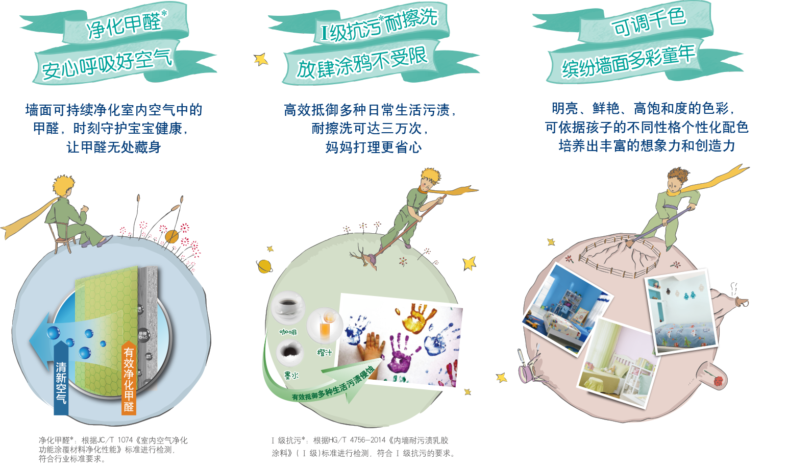 净化甲醛 安心呼吸好空气,I级抗污耐擦洗 放肆涂鸦不受限,可调千色 缤纷墙面多彩童年